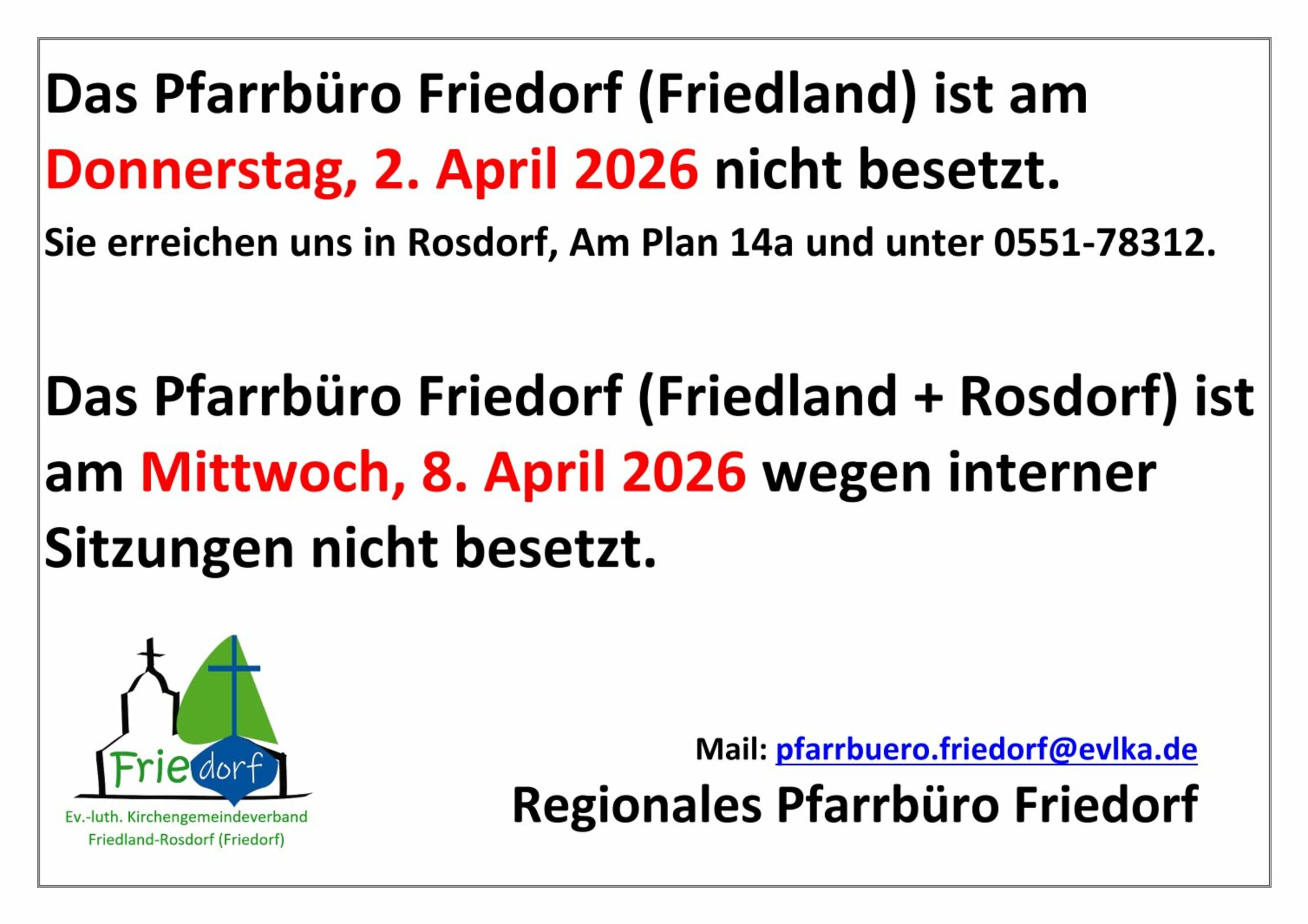 Freitag: 9:00-12:00 Uhr (Friedland/Rosdorf)